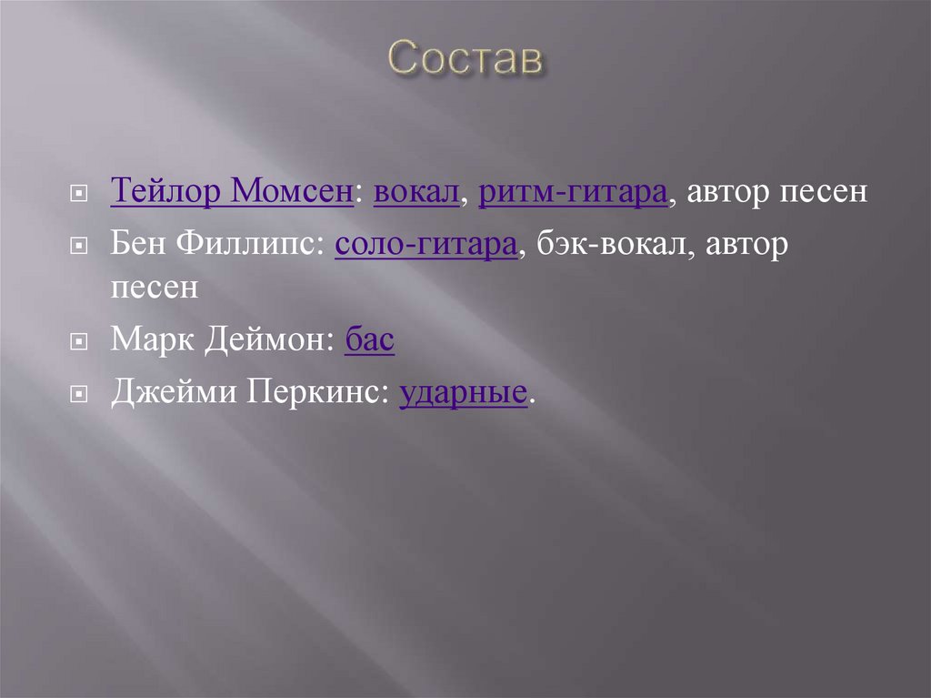 Тейлор Момсен: вокал, ритм-гитара, автор песенБен Филлипс: соло-гитара, бэк-вокал, автор
