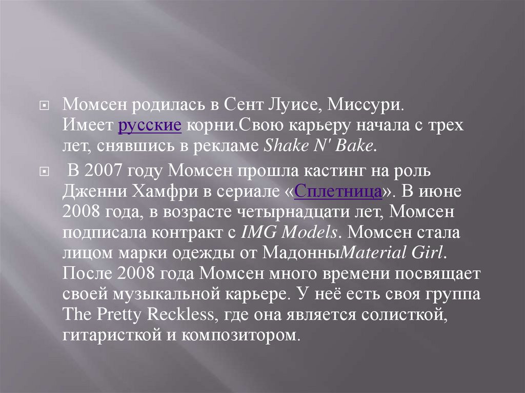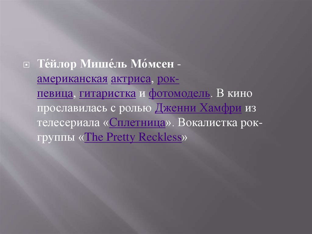 Те́йлор Мише́ль Мо́мсен американская актриса, рокпевица, гитаристка и фотомодель. В кинопрославилась с ролью Дженни Хамфри из