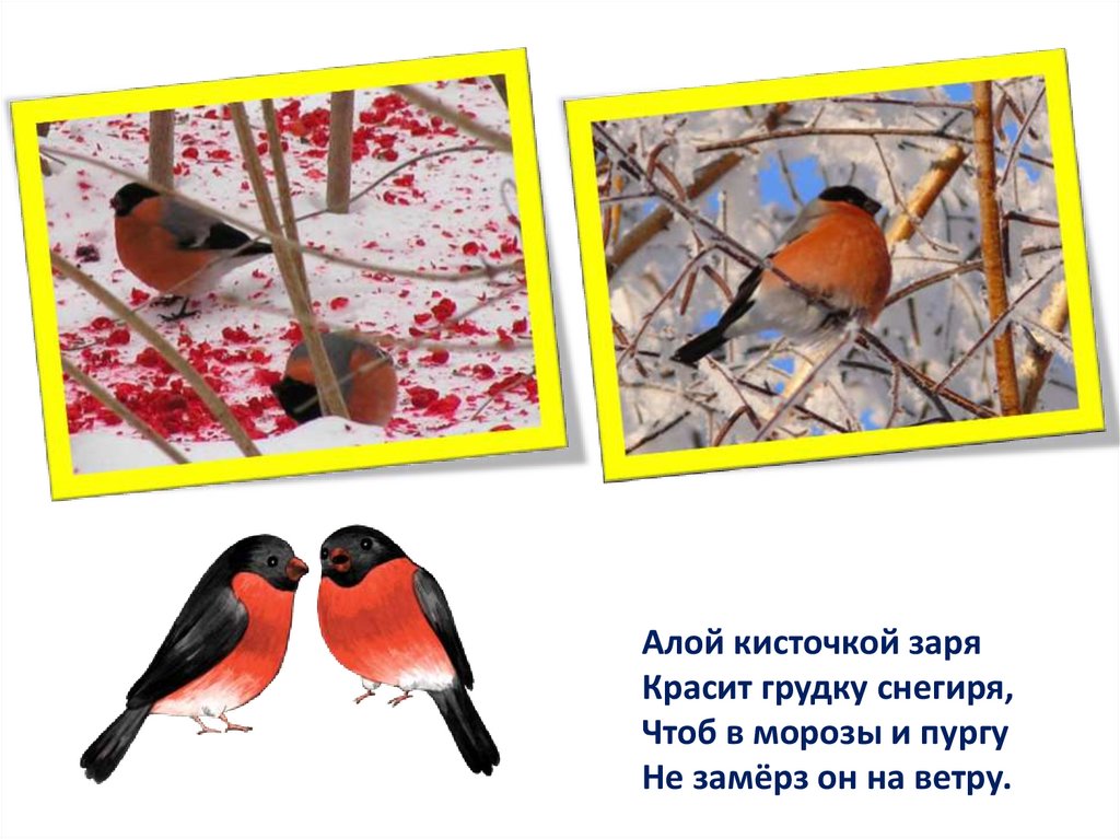 Алой кисточкой заряКрасит грудку снегиря,