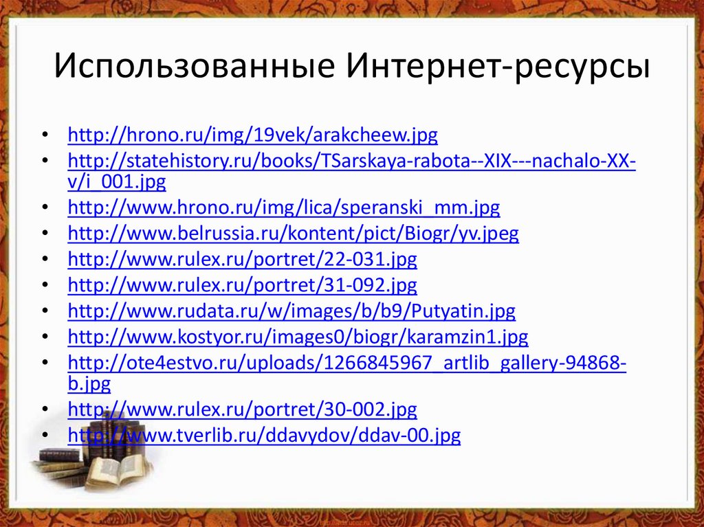 Использованные Интернет-ресурсы• http://hrono.ru/img/19vek/arakcheew.jpg