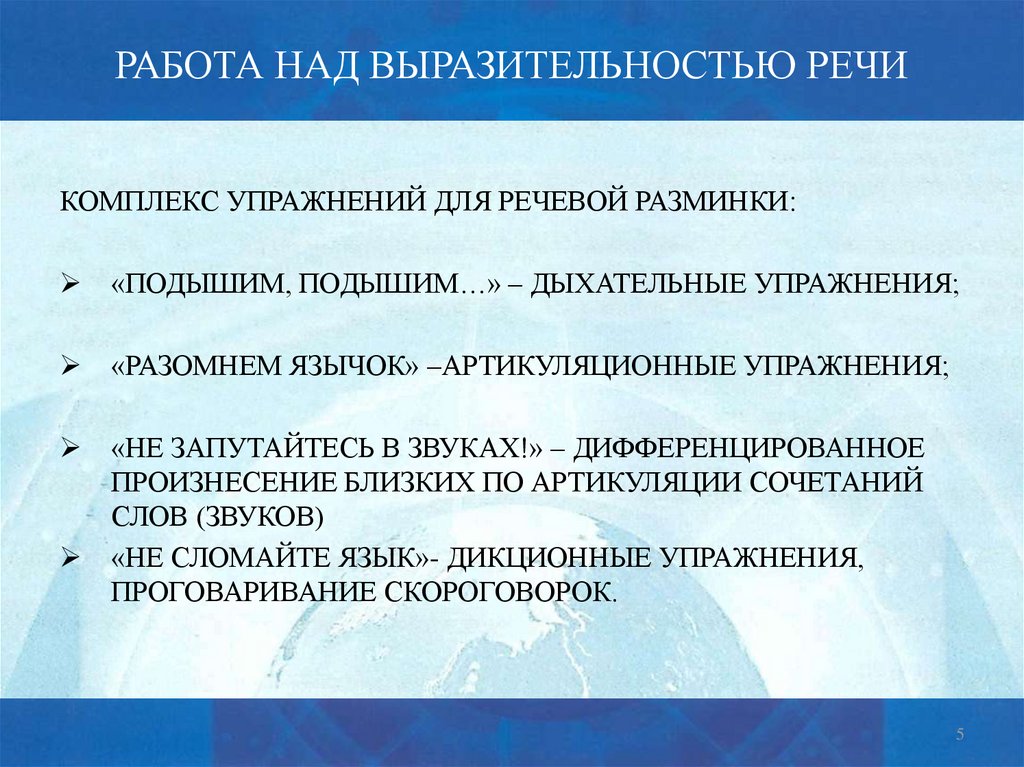 РАБОТА НАД ВЫРАЗИТЕЛЬНОСТЬЮ РЕЧИКОМПЛЕКС УПРАЖНЕНИЙ ДЛЯ РЕЧЕВОЙ РАЗМИНКИ:
