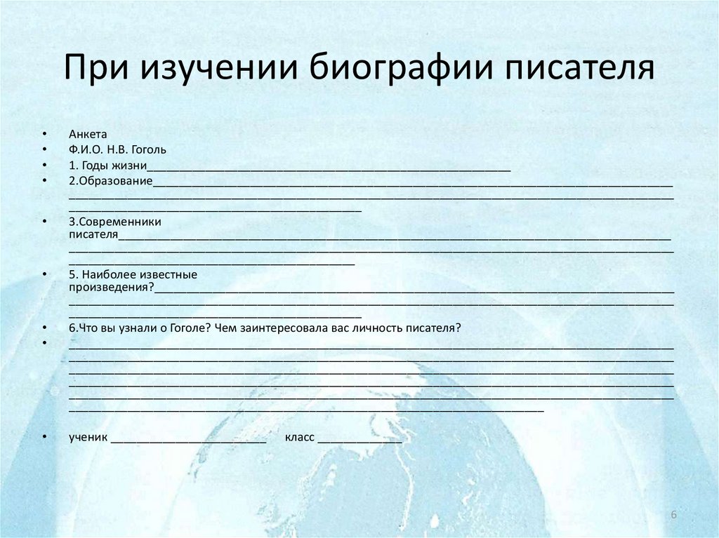При изучении биографии писателяАнкета