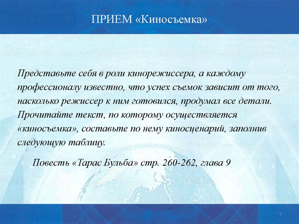 «киносъемка», составьте по нему киносценарий, заполнив