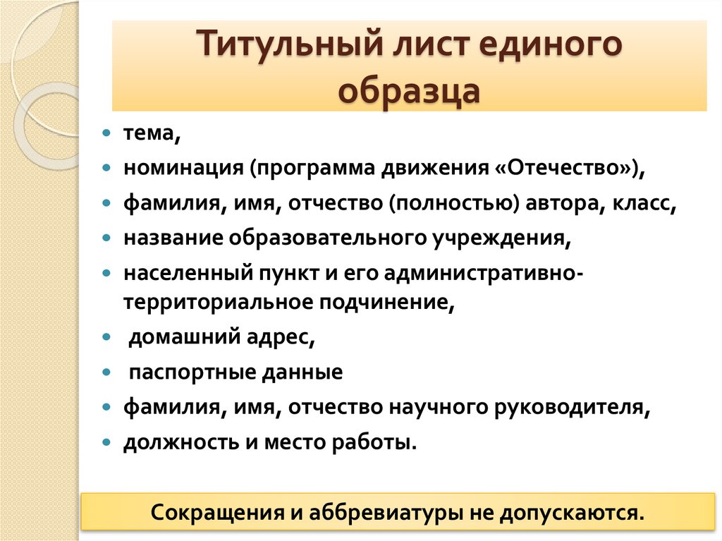 Сокращения и аббревиатуры не допускаются.