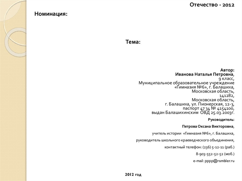 Отечество - 2012Номинация: