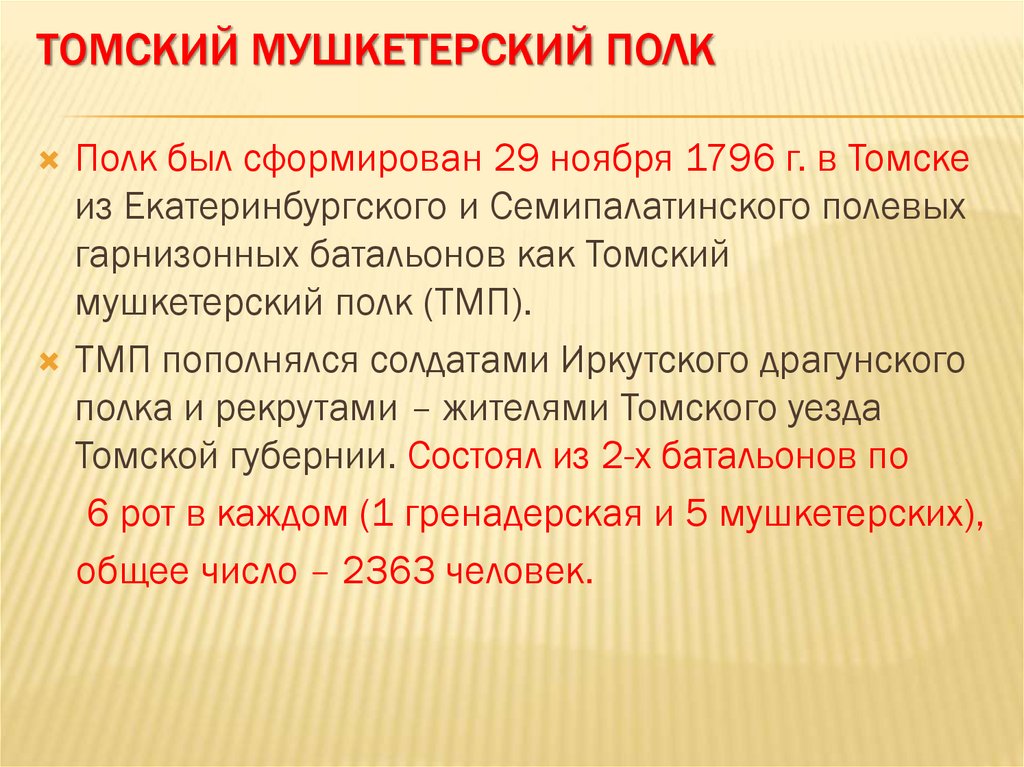 ТОМСКИЙ МУШКЕТЕРСКИЙ ПОЛКПолк был сформирован 29 ноября 1796 г. в Томске