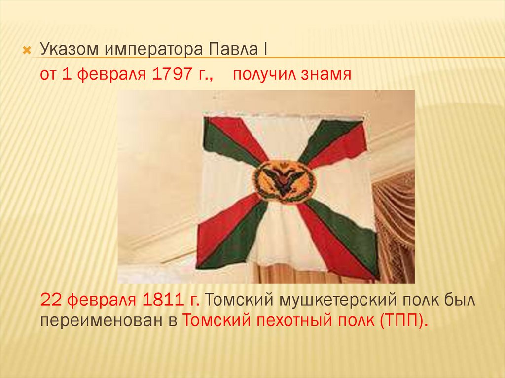Указом императора Павла Iот 1 февраля 1797 г., получил знамя