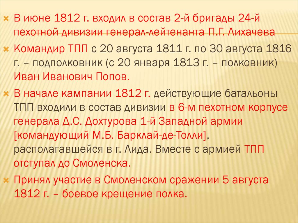В июне 1812 г. входил в состав 2-й бригады 24-йпехотной дивизии генерал-лейтенанта П.Г. Лихачева