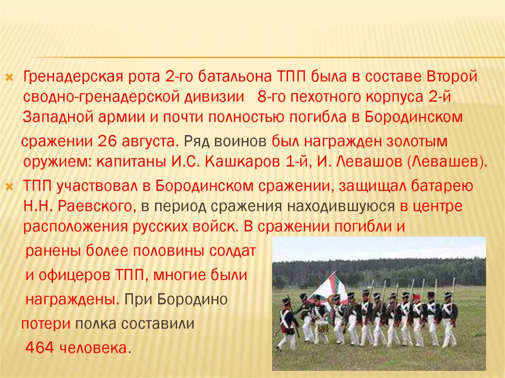 Гренадерская рота 2-го батальона ТПП была в составе Второйсводно-гренадерской дивизии 8-го пехотного корпуса 2-й
