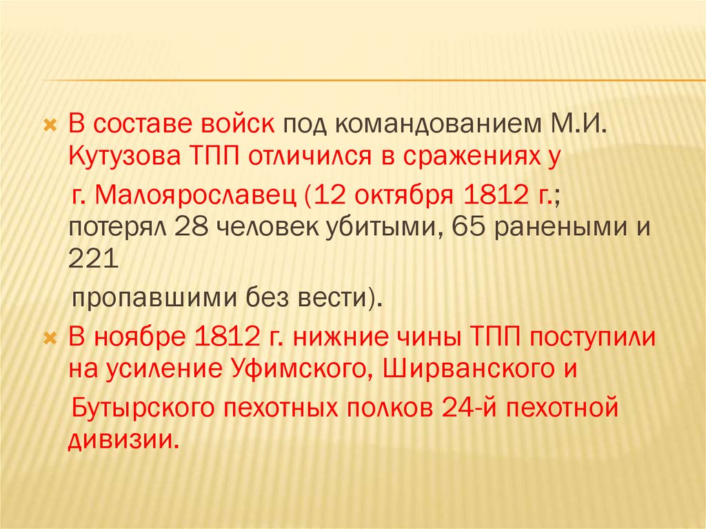 В составе войск под командованием М.И.Кутузова ТПП отличился в сражениях у