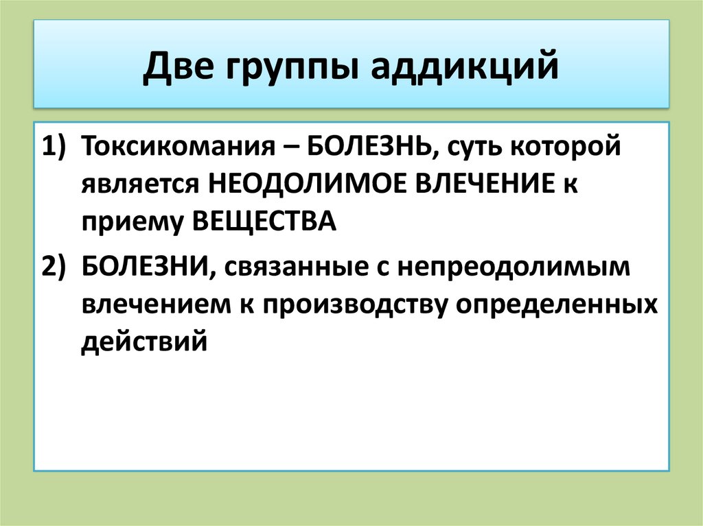 Две группы аддикций1) Токсикомания – БОЛЕЗНЬ, суть которой