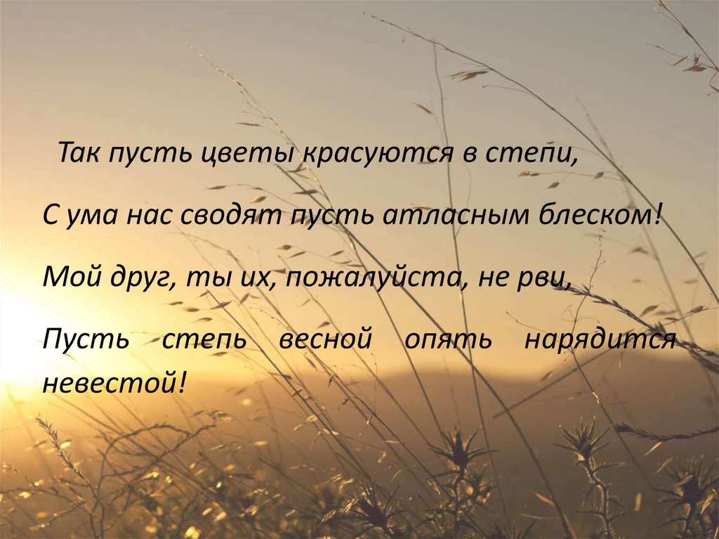 Так пусть цветы красуются в степи,С ума нас сводят пусть атласным блеском!