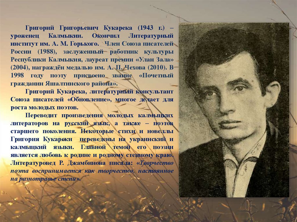 Григорий Григорьевич Кукарека (1943 г.) –уроженец Калмыкии. Окончил Литературный