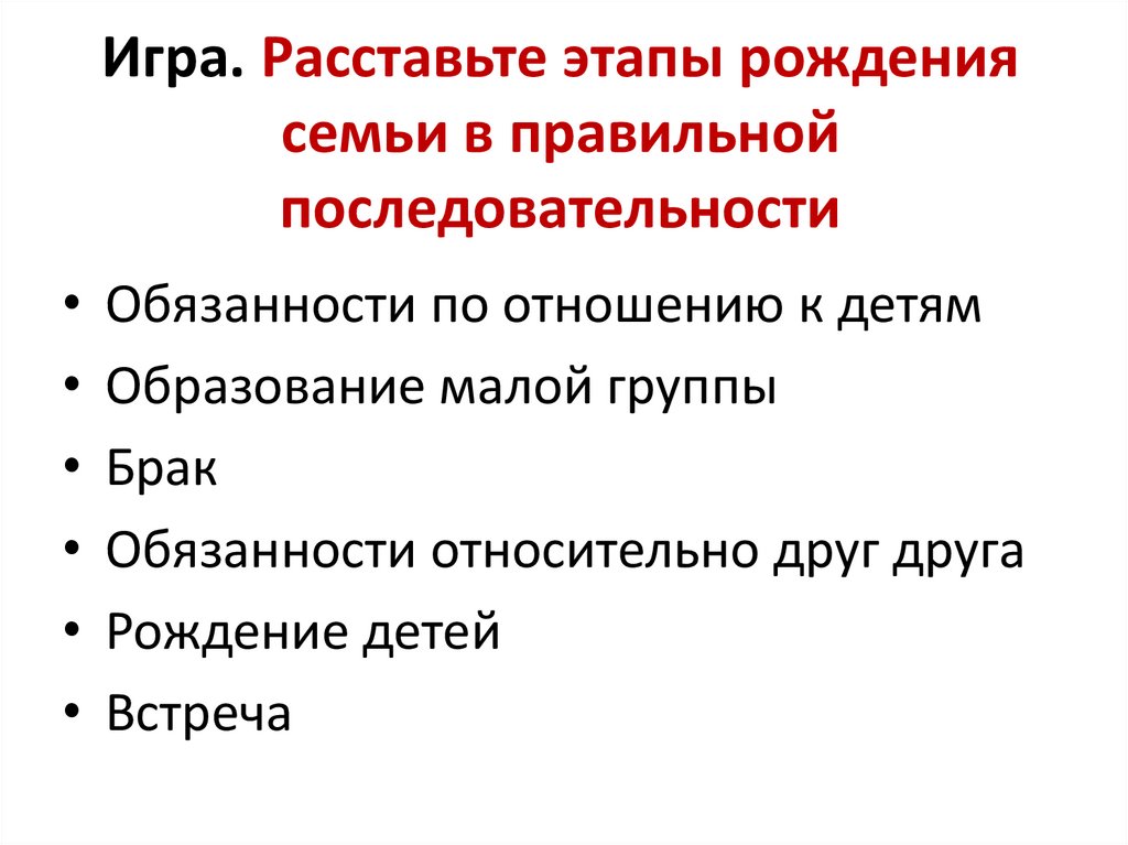 Игра. Расставьте этапы рождениясемьи в правильной