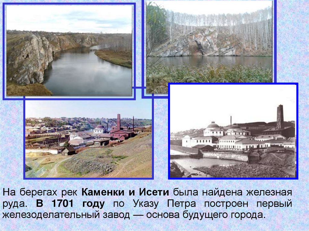 На берегах рек Каменки и Исети была найдена железнаяруда. В 1701 году по Указу Петра построен первый