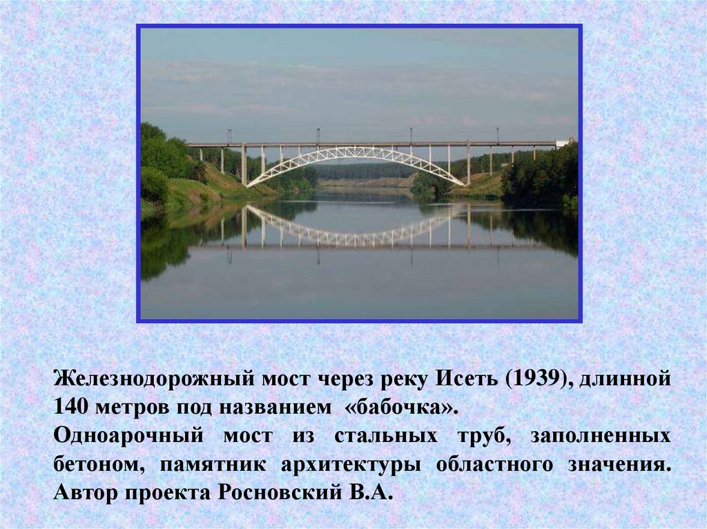 Железнодорожный мост через реку Исеть (1939), длинной140 метров под названием «бабочка».