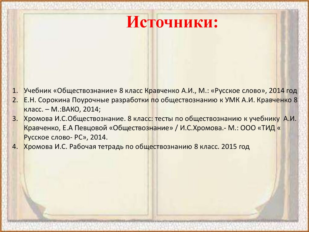 Источники:1. Учебник «Обществознание» 8 класс Кравченко А.И., М.: «Русское слово», 2014 год