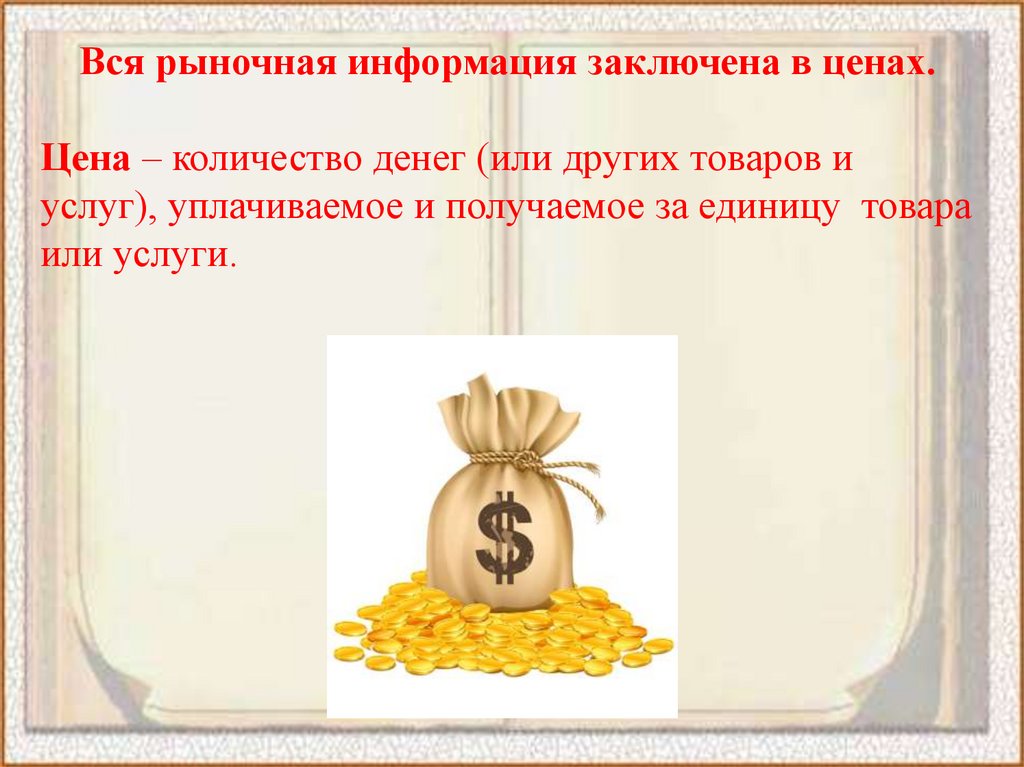 Вся рыночная информация заключена в ценах.Цена – количество денег (или других товаров и