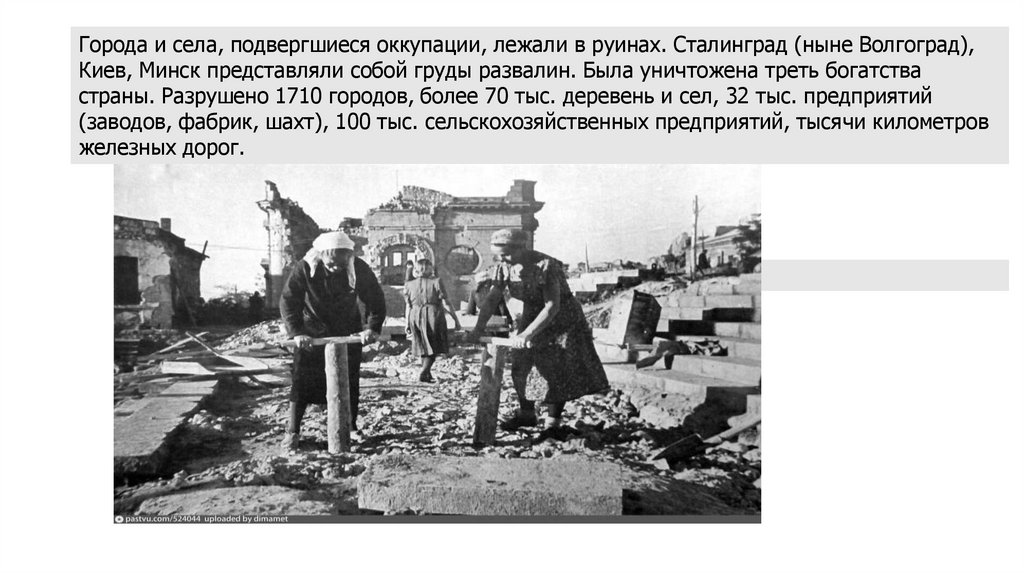 Города и села, подвергшиеся оккупации, лежали в руинах. Сталинград (ныне Волгоград),Киев, Минск представляли собой груды развалин. Была уничтожена треть богатства