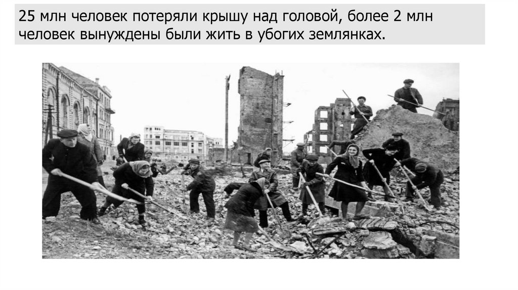 25 млн человек потеряли крышу над головой, более 2 млнчеловек вынуждены были жить в убогих землянках.