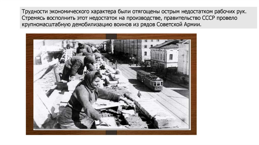 Трудности экономического характера были отягощены острым недостатком рабочих рук.Стремясь восполнить этот недостаток на производстве, правительство СССР провело