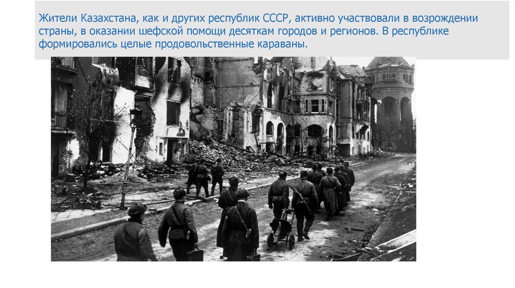 Жители Казахстана, как и других республик СССР, активно участвовали в возрождениистраны, в оказании шефской помощи десяткам городов и регионов. В республике