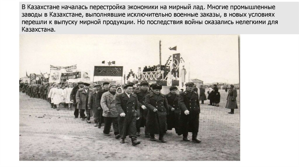 В Казахстане началась перестройка экономики на мирный лад. Многие промышленныезаводы в Казахстане, выполнявшие исключительно военные заказы, в новых условиях