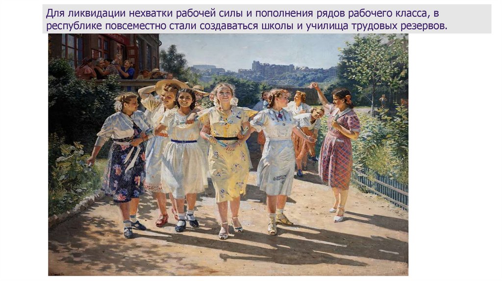 Для ликвидации нехватки рабочей силы и пополнения рядов рабочего класса, вреспублике повсеместно стали создаваться школы и училища трудовых резервов.