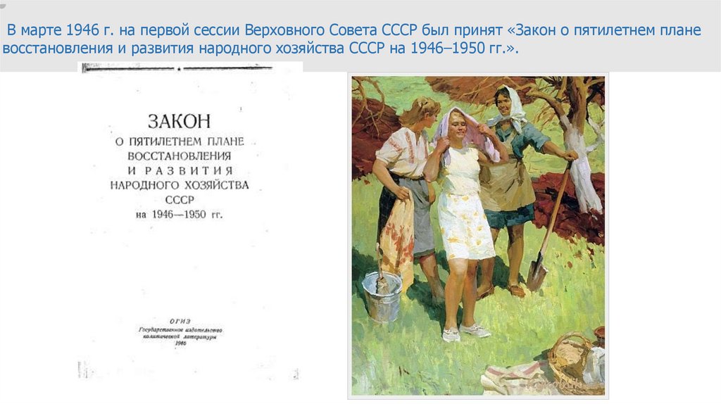 В марте 1946 г. на первой сессии Верховного Совета СССР был принят «Закон о пятилетнем планевосстановления и развития народного хозяйства СССР на 1946–1950 гг.».