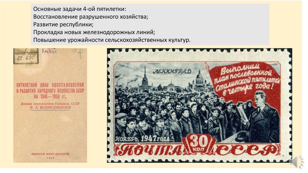 Основные задачи 4-ой пятилетки:Восстановление разрушенного хозяйства;