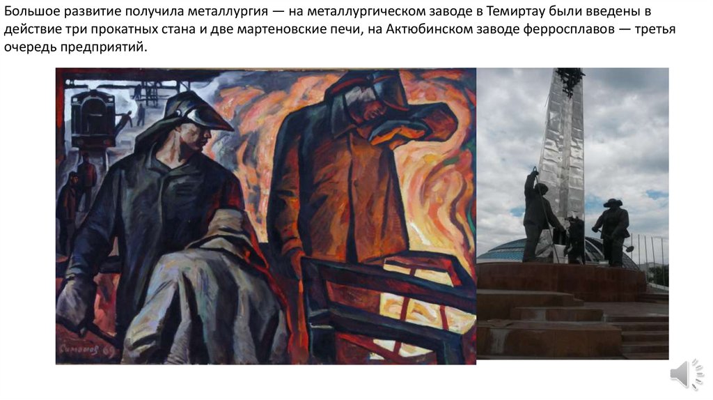 Большое развитие получила металлургия — на металлургическом заводе в Темиртау были введены вдействие три прокатных стана и две мартеновские печи, на Актюбинском заводе ферросплавов — третья