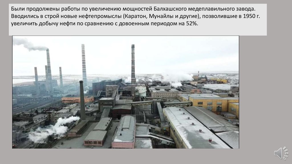 Были продолжены работы по увеличению мощностей Балхашского медеплавильного завода.Вводились в строй новые нефтепромыслы (Каратон, Мунайлы и другие), позволившие в 1950 г.