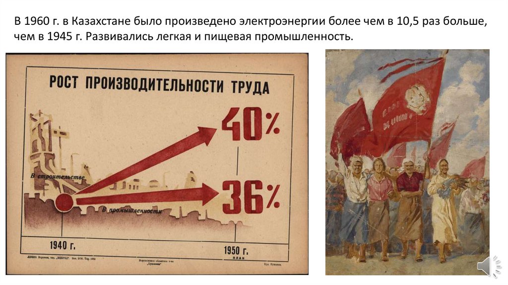 В 1960 г. в Казахстане было произведено электроэнергии более чем в 10,5 раз больше,чем в 1945 г. Развивались легкая и пищевая промышленность.