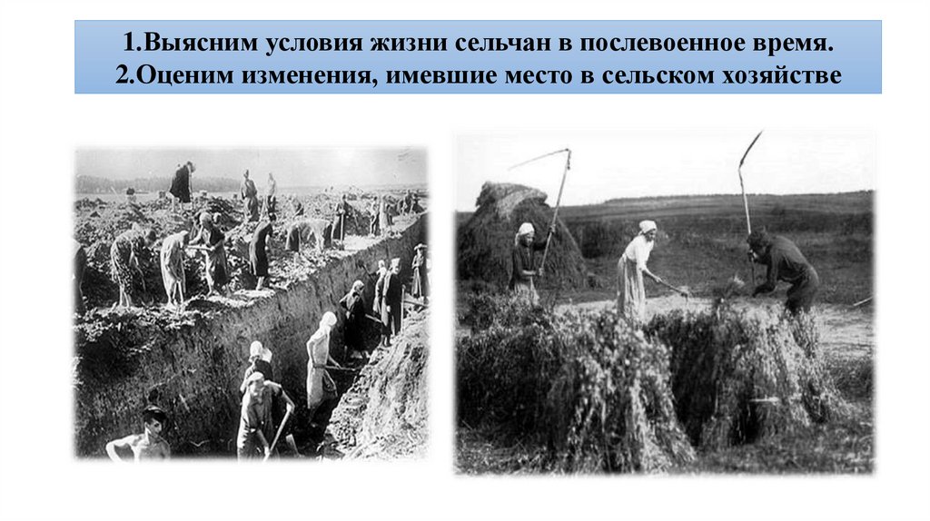 1.Выясним условия жизни сельчан в послевоенное время.2.Оценим изменения, имевшие место в сельском хозяйстве