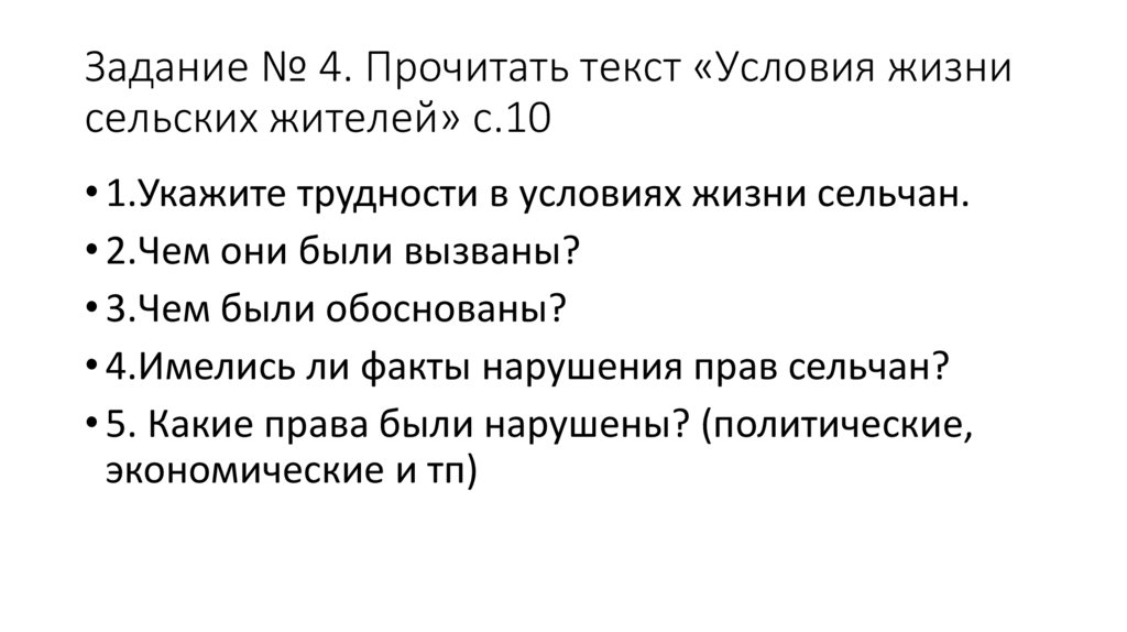 Задание № 4. Прочитать текст «Условия жизнисельских жителей» с.10