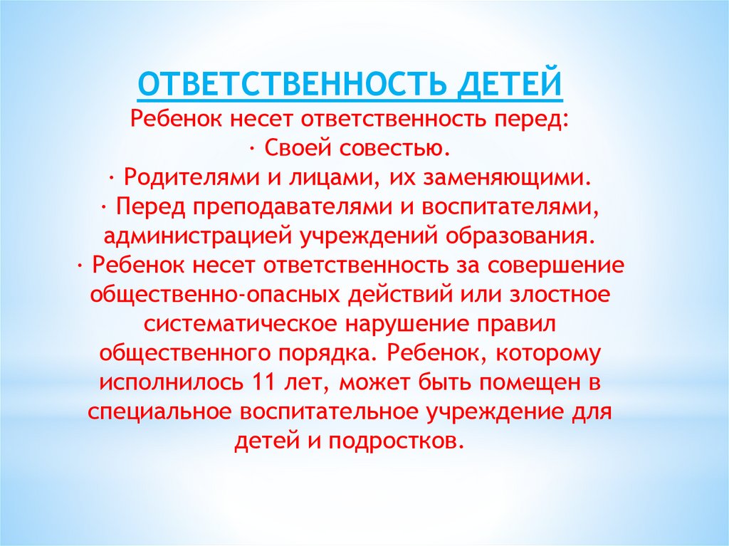 ОТВЕТСТВЕННОСТЬ ДЕТЕЙРебенок несет ответственность перед: