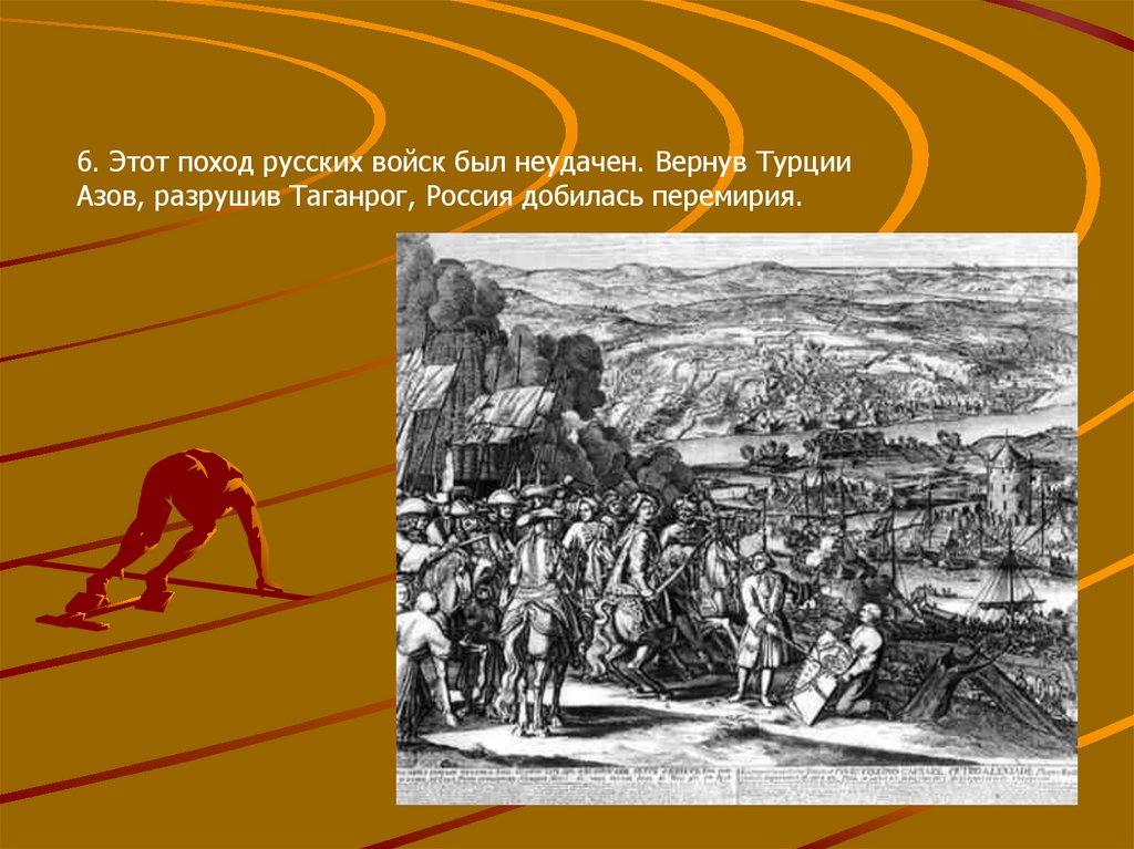 6. Этот поход русских войск был неудачен. Вернув ТурцииАзов, разрушив Таганрог, Россия добилась перемирия.