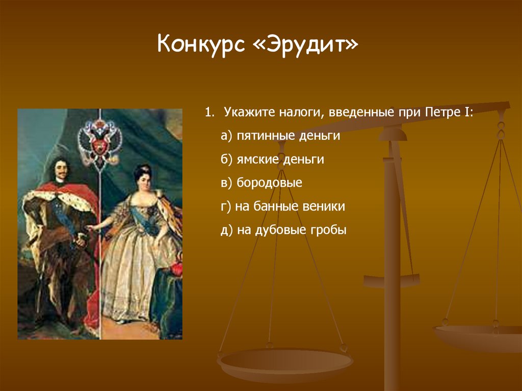 Конкурс «Эрудит»1. Укажите налоги, введенные при Петре I: