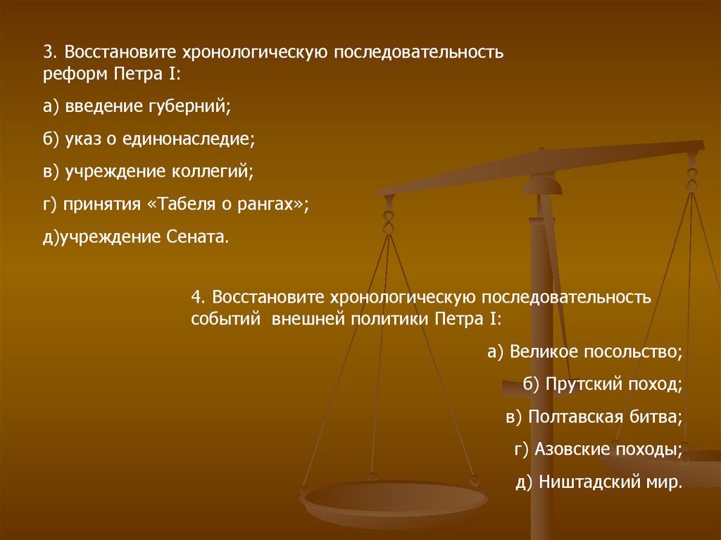 3. Восстановите хронологическую последовательностьреформ Петра I: