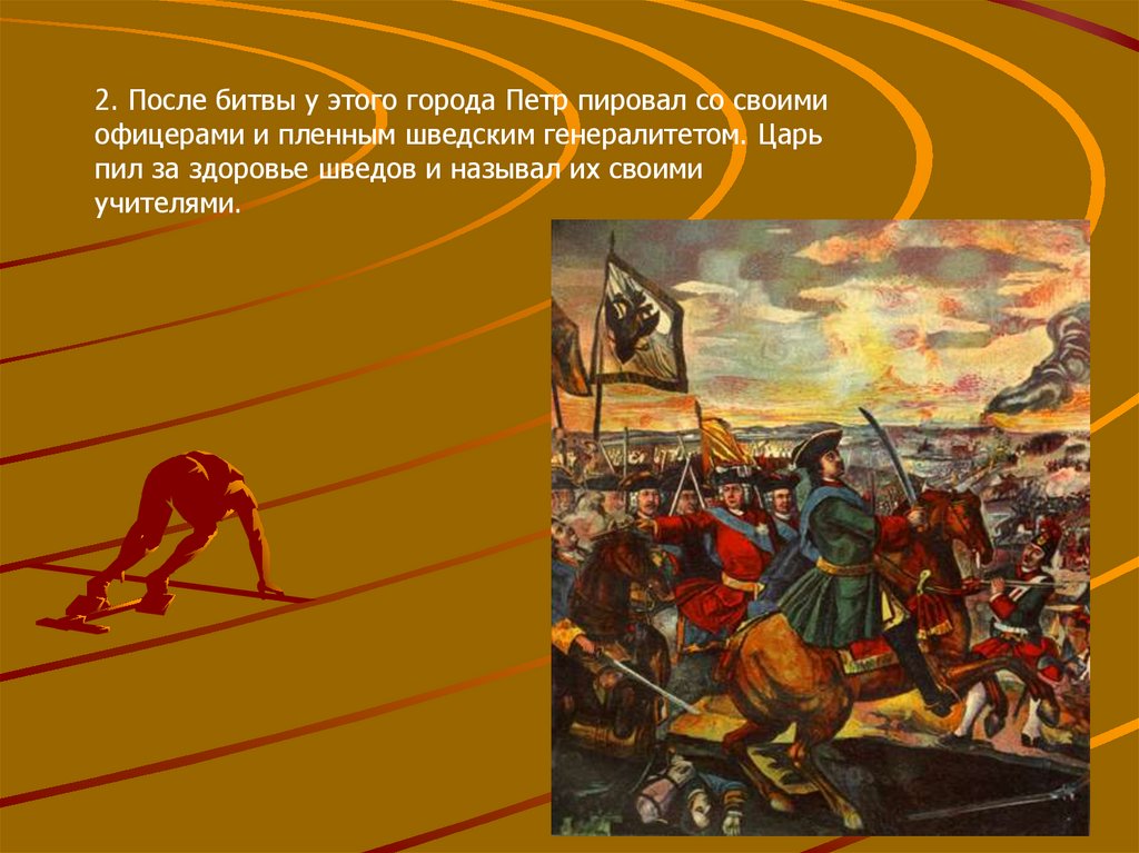 2. После битвы у этого города Петр пировал со своимиофицерами и пленным шведским генералитетом. Царь