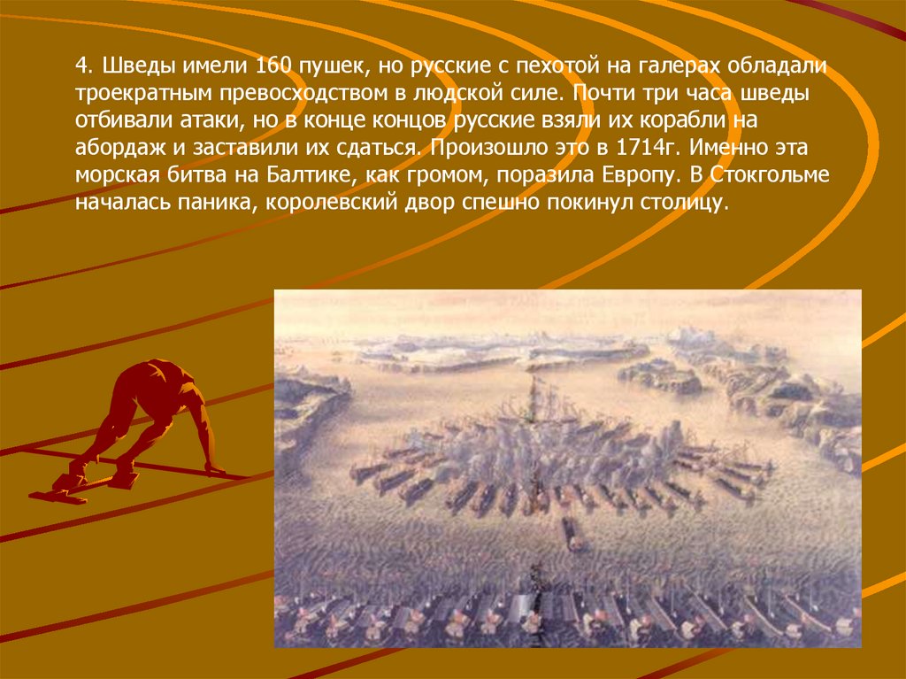4. Шведы имели 160 пушек, но русские с пехотой на галерах обладалитроекратным превосходством в людской силе. Почти три часа шведы