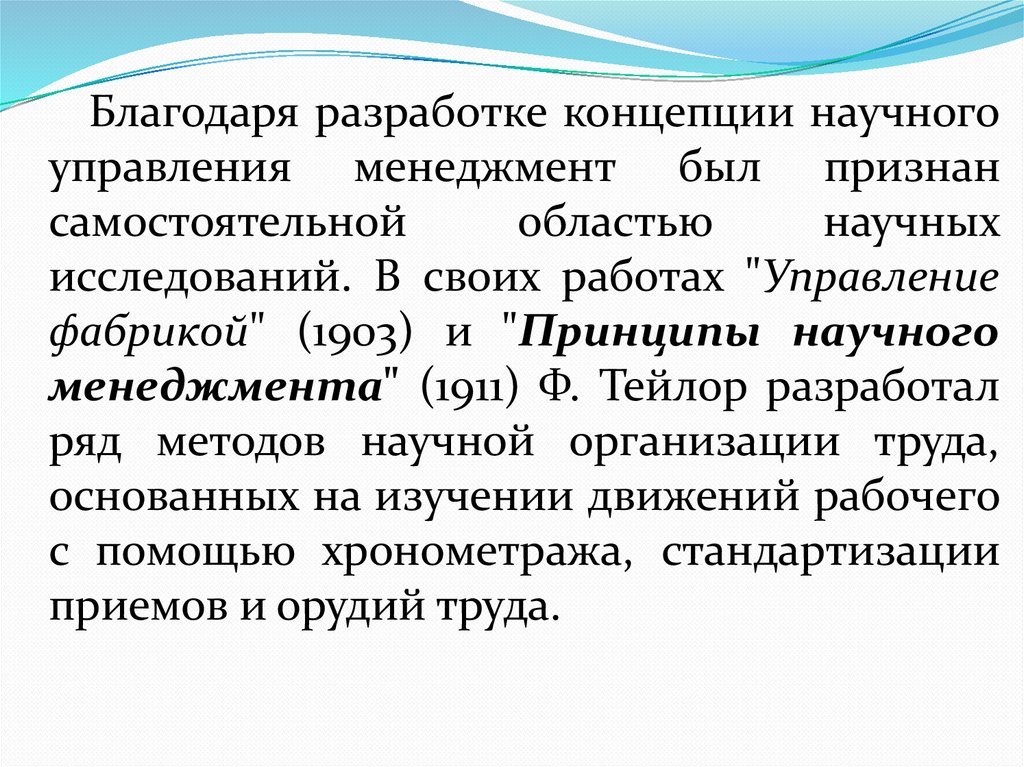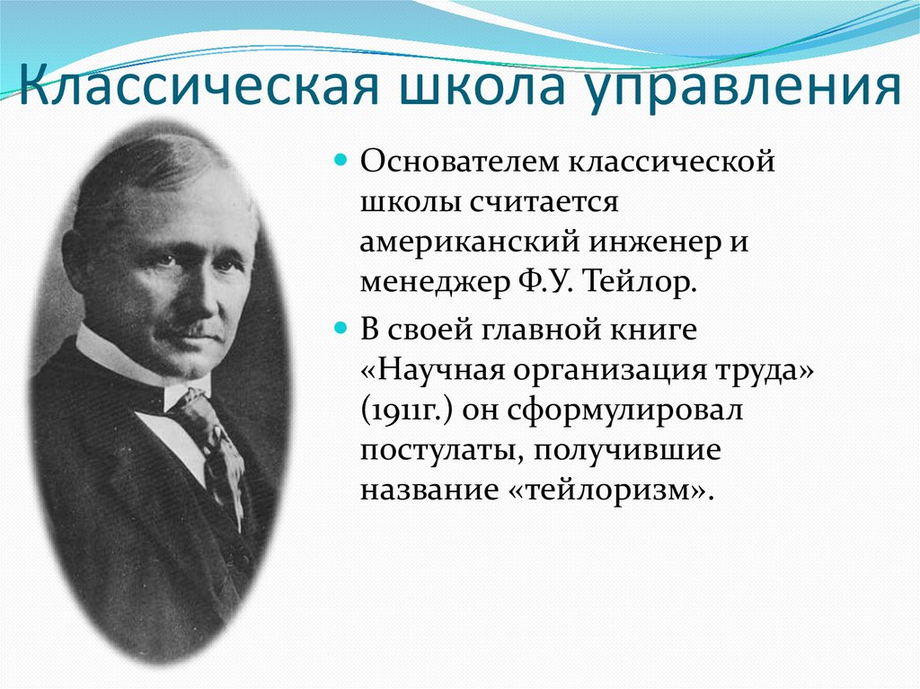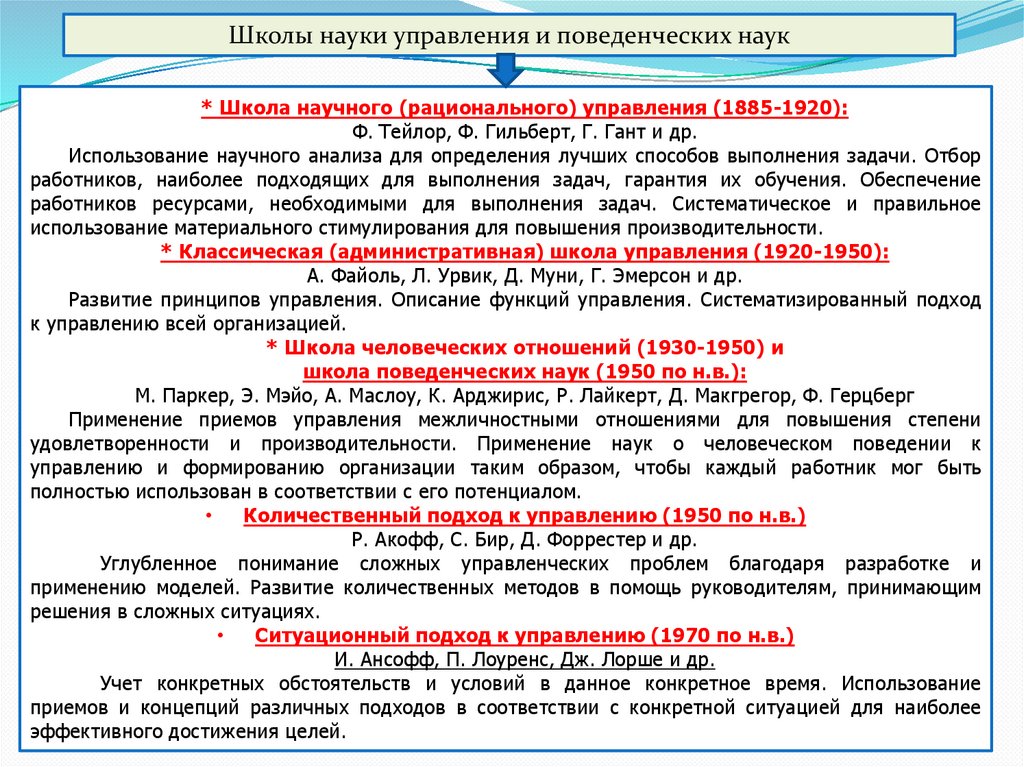 Школы науки управления и поведенческих наук* Школа научного (рационального) управления (1885-1920):