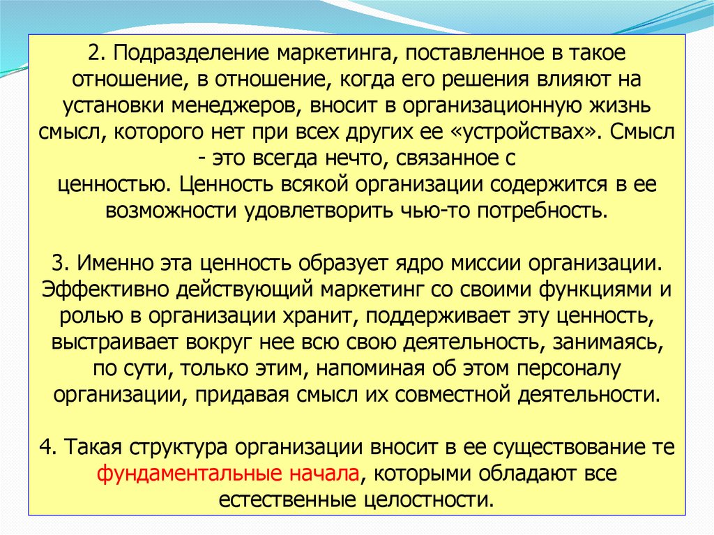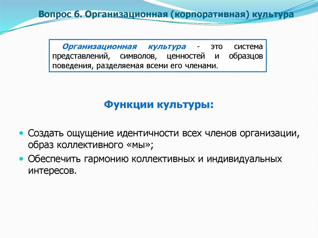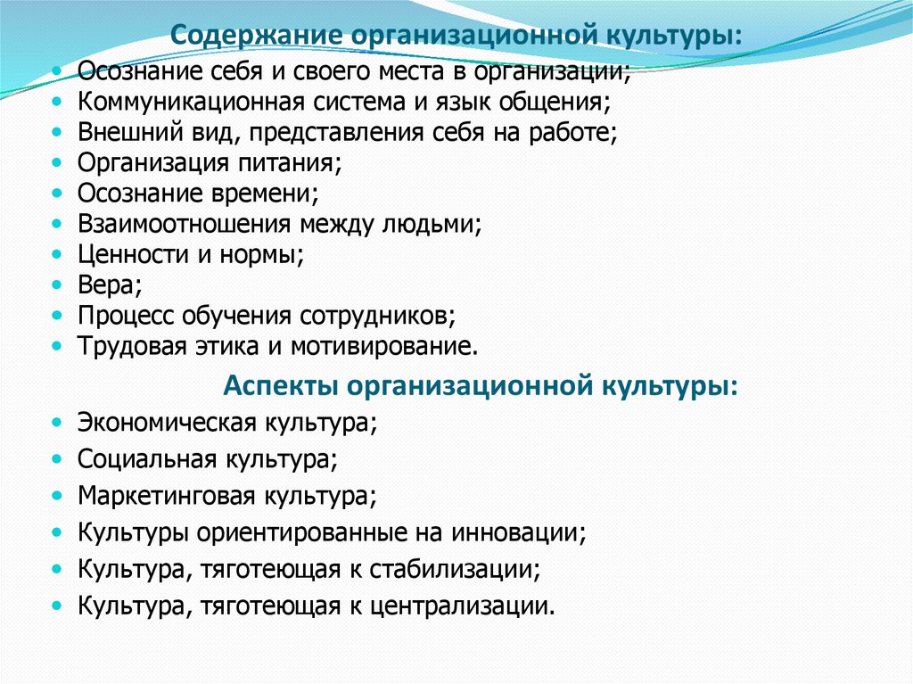 Содержание организационной культуры:Осознание себя и своего места в организации;