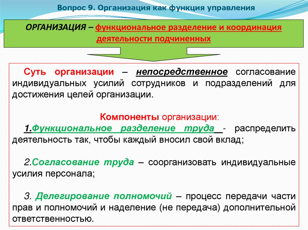 Вопрос 9. Организация как функция управленияОРГАНИЗАЦИЯ – функциональное разделение и координация