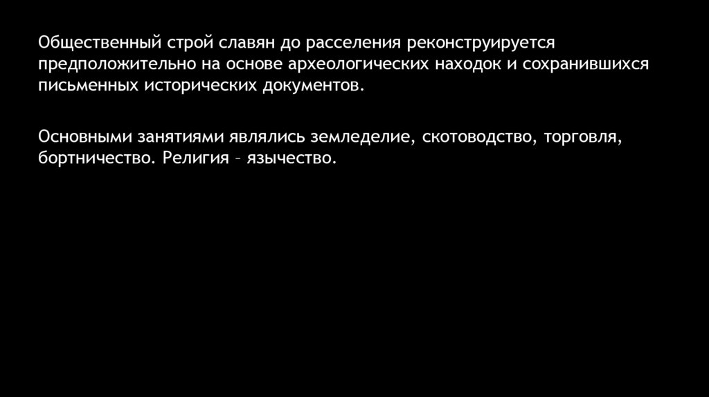 Общественный строй славян до расселения реконструируетсяпредположительно на основе археологических находок и сохранившихся