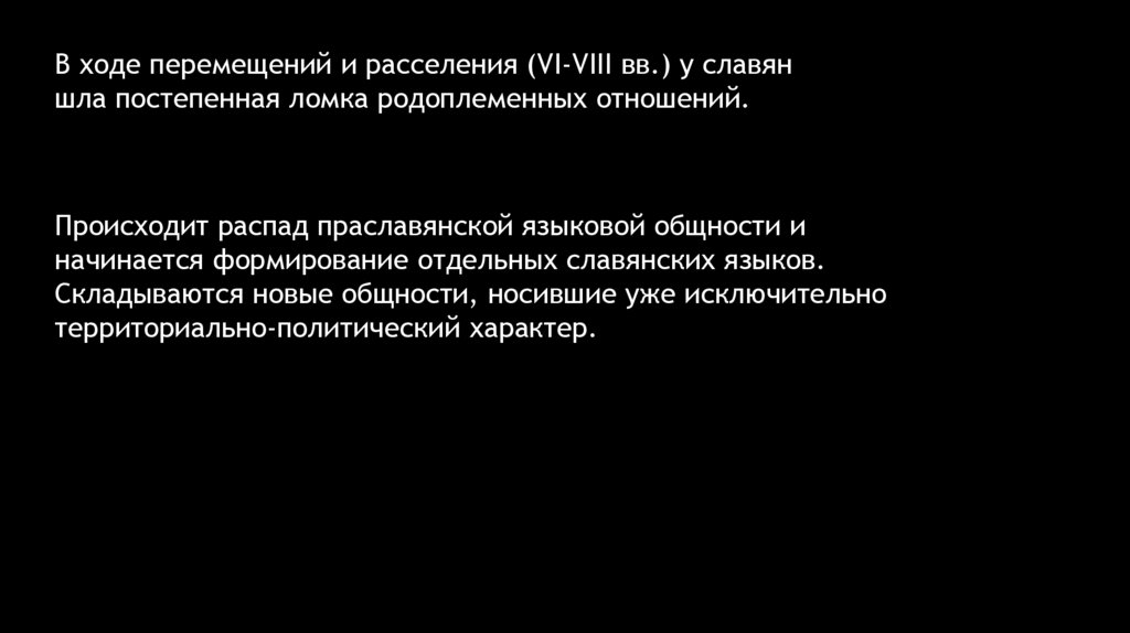 В ходе перемещений и расселения (VI-VIII вв.) у славяншла постепенная ломка родоплеменных отношений.