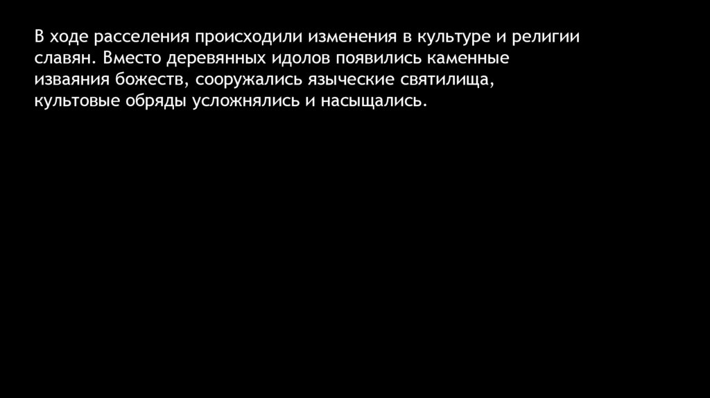 В ходе расселения происходили изменения в культуре и религииславян. Вместо деревянных идолов появились каменные
