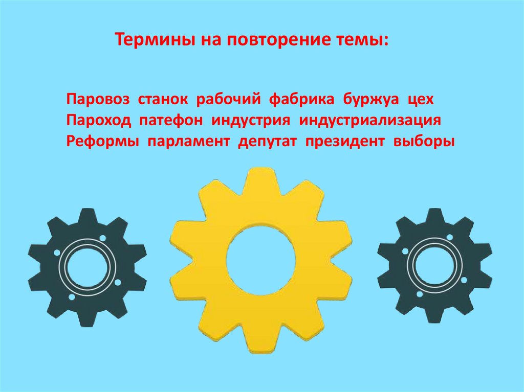 Термины на повторение темы:Паровоз станок рабочий фабрика буржуа цех