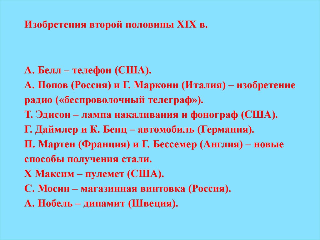 А. Нобель – динамит (Швеция).