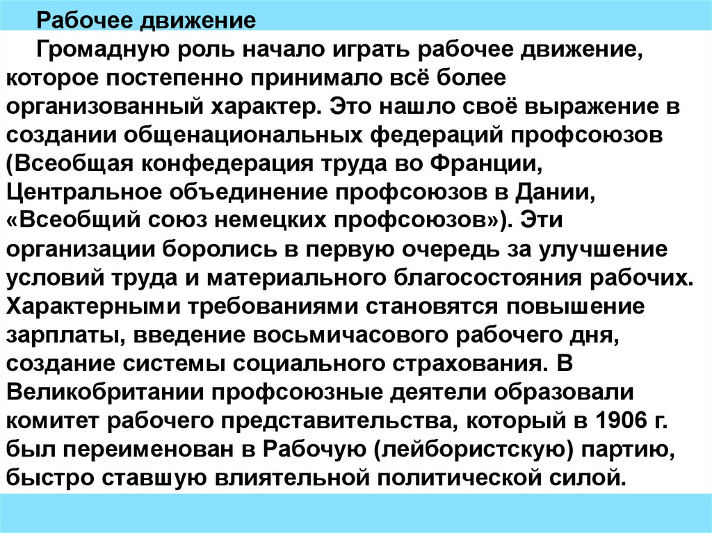 Рабочее движениеГромадную роль начало играть рабочее движение,